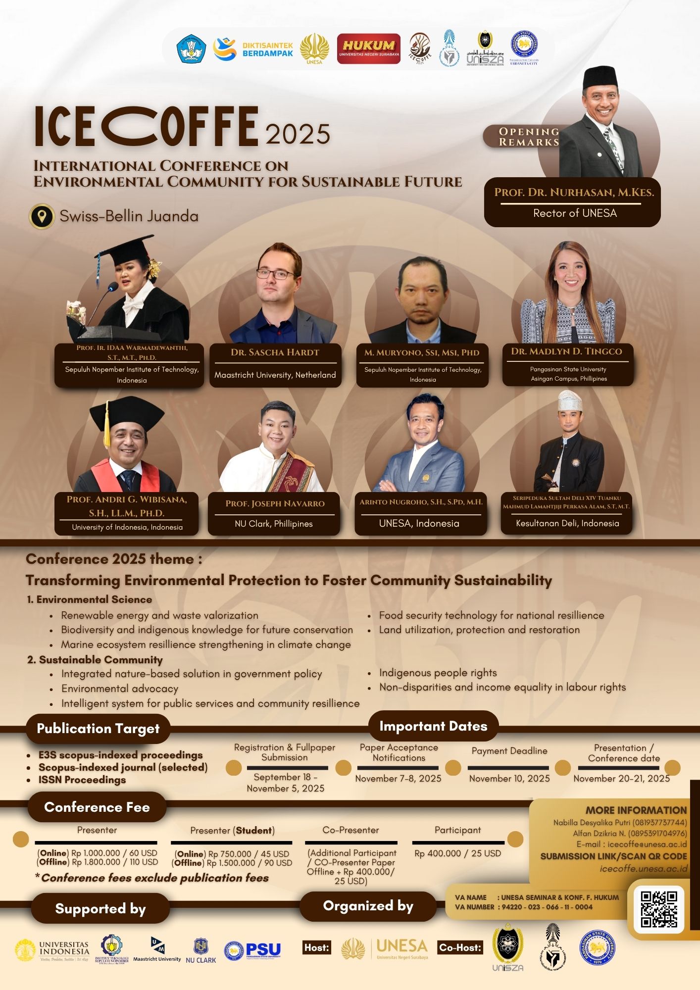 International Conference on Environmental Community for Sustainable Future (ICECOFFE) 2025 themed “Transforming Environmental Protection to Foster Community Sustainabilty” is an international forum that gather civitas academica all around the world to discuss, analyzed and advancing the understanding and implementation of environmental community protection for sustainable future regarding the Sustainable Development Goals (SDGs). This conference involves policymakers, researchers, practitioners, and community stakeholders as a hexa-helix collaboration model to explore innovative strategies and practical solutions to achieve SDGs target in the 2030 Agenda. The conference’s theme and scope divided to : (1) Environmental Sciences; (2) Sustainable Community.
